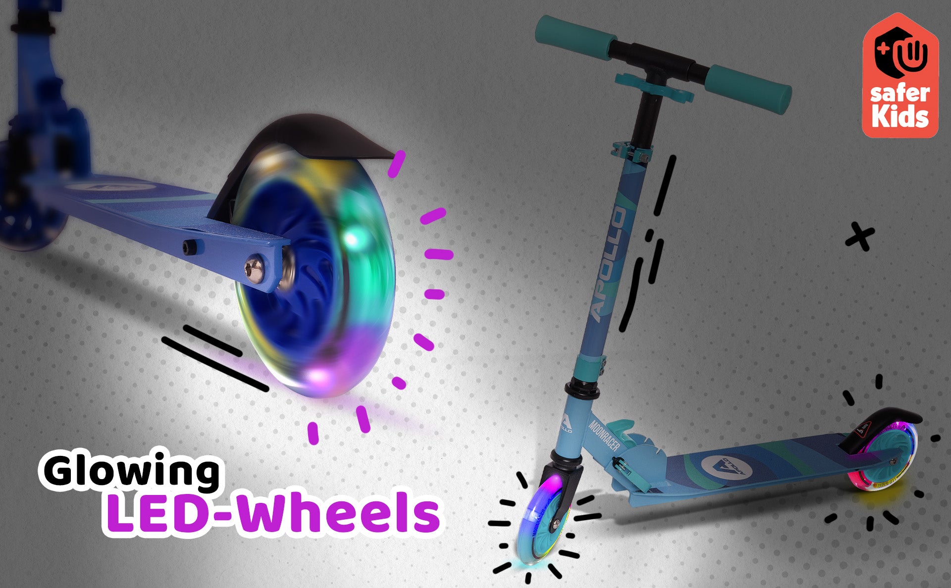 Świecąca przyjemność z jazdy: hulajnoga Apollo City dla dzieci jest składana i ma regulowaną wysokość, jest wyposażona w amortyzatory i łożyska kulkowe Abec 7. Świecące kółka LED 125 mm sprawiają, że nasza hulajnoga przyciąga wzrok